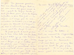 En mer Dimanche soir 22 mars [1885]. Il s’est embarqué, et est bien triste de ne pouvoir être au mariage de Ninette. « Jusqu’au départ du Mytho j’ai eu une bonne et joyeuse escorte, une vraie cour, qui réussissait à m’étourdir ; mais à présent, seul au milieu d’inconnus, j’ai conscience d’une sorte d’effondrement de toute ma vie passée, je ne me sens aucun entrain pour cette campagne dont le terme est entouré de tant d’incertitudes. Je pars avec de pauvres gens aussi peu convaincus que moi de l’aventure dans laquelle on nous lance. […] Je pense que le 8 avril je serai dans le beau bleu de la mer des Indes, le grand soleil que je vais trouver là-bas me consolera un peu »…