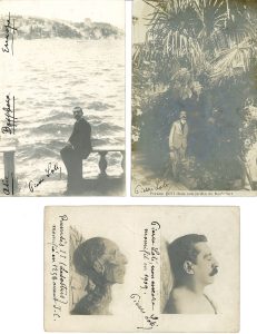Carte postale aux têtes de Loti et Ramsès II avec légende autographe : « Pierre Loti, non encore momifié en 1909. Ramsès II (Sésostris) momifié en 1258 avant J.C. » ; plus une autre avec légende impr., écrite au verso. Photographie signée et annotée sur les rives du Bosphore. Loti dans le jardin de Rochefort.