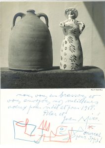 Joan MIRÓ (1893-1983). L.A.S. avec dessin, [Palma de Mallorca fin décembre 1957], à Peter et Hélène Bellew à Melbourne ; en bas d’une carte 23,5 x 17 cm illustrée d’une photographie noir et blanc d’objets en céramique catalans, le...