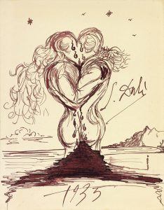Nombreuses illustrations en noir et deux gravures originales représentant la Crucifixion signées par Salvador Dali. ¶ Tirage à 175 exemplaires, celui-ci l'un des 140 sur Rives. ¶ Chemise usagée, dos refait, petite étiquette J'aime Dali par Ben Vautrier contrecollée sur le contreplat, petite tache sur la seconde gravure, une lettre de la pièce de titre de l'emboîtage frottée.