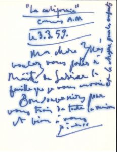 Pablo PICASSO (1881-1973). L.A.S., “La Californie” Cannes 3 mars 1959, à Inès Sassier, 7 rue des Grands Augustins ; 1 page in‑4 au feutre bleu, enveloppe autographe (signée au dos). Il lui demande de porter à Maître de Sarriac la...