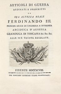 ARTICOLI DI GUERRA CHE SUA ALTEZZA REALE FERDINANDO III [...] ha ordinati, e prescritti a tutte le sue truppe. — Firenze : Per Gaetano Cambiagi, 1792. — In-4° (mm 202x145).