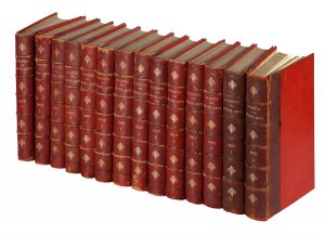 Legatura in mezza pelle rossa con piatti in tela, titoli impressi in oro ai dorsi a 5 nervi. Dorso di un volume staccato ; abrasioni e spellature, seppur minime, lungo le cerniere e i dorsi degli altri volumi. (14)