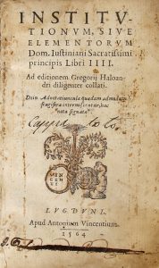 INSTITUTIONUM , SIVE ELEMENTORUM DOM. — Lustiniani Sacratissimi principis Libri IIII... — Lugduni : Apud Antonium Vincentium, 1564. — In-8° piccolo (mm 120X70).