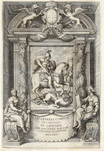 Bel frontespizio calcografico con stemma di Genova in alto e vignetta con san Giorgio e il drago entro bella bordura architettonica da disegno di Domenico Fiasella, marca dello stampatore xilografica in fine.