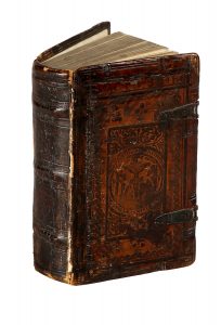 Legatura cinquecentesca in pelle montata su assicelle di legno con cornici concentriche di duplici filetti al piatto anteriore, al centro la Crocifissione di Cristo in ovale circondata da fregi a motivi fogliati e in alto titolo dell'opera ; al piatto posteriore raffigurazioni delle Muse in due fasce circondate da bande e filetti, il tutto impresso a secco.