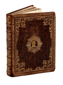 Legatura settecentesca con elaborata cornice a motivi fogliati alternata a filetti e a dente di topo, con volute fogliate e ghiande ai piccoli ferri accantonate interne, al centro dei piatti ritratto della Vergine Maria in ovale, il tutto impresso in oro ; titoli dorati su tassello al dorso a 6 nervi e comparti decorati.