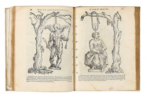 Frontespizio entro elaborata cornice architettonica popolata da figure allegoriche, ritratto dell'Autore al verso del frontespizio, graziosi capilettera figurati e moltissime illustrazioni nel testo, anche a piena pagina, il tutto inciso in legno. Le due tavole xilografiche che normalmente si annoverano fuori testo in questa copia sono numerate 284-285 e sono legate dopo carta S8.