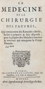ALEXANDRE NICOLAS, — La médecine et la chirurgie des pauvres, qui contiennent des remèdes choisis [...] pour la plupart des Maladies... — A Paris : chez Laurent Le Conte, 1740. — In-12° (mm 163x93).