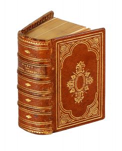 Pagine [6], 499, [1]. Ritratto di Dante in antiporta. Legatura coeva in piena pelle con ovale centrale circondato da gigli stilizzati e cornice di filetti dorati ai piatti, titoli e fregi impressi in oro al dorso a 4 nervi, unghiature a dentelles, tagli dorati..