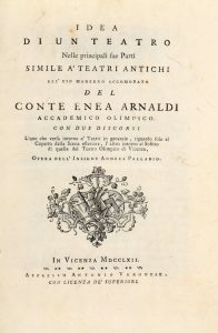 ARNALDI ENEA, — Idea di un teatro nelle principali sue parti simile a' teatri antichi all'uso moderno accomodato... — In Vicenza : Appresso Antonio Veronese, 1762. — In-4° (mm 244x185).
