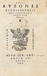 AUSONIUS DECIMUS MAGNUS, — Opuscula varia. — Lugduni : apud Seb. Gryphium, 1549. — 3 opere in 1 volume in-16° (mm 118x72).