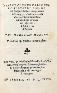 AVILA Y ZUNIGA LUIS de, — Brieve commentario [...] nella Guerra della Germania fatta dal felicissimo et maximo Imperatore Carlo V d'Austria... — Venezia : [s.e.], 1548. — In-8° (mm 150x105).