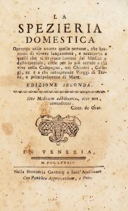 AZZOGUIDI GERMANO, — La spezieria domestica. — Operetta utile a tutte quelle persone, che bramano di vivere lungamente... — In Venezia : Nella stamperia Graziosi, 1784. — In-8° (mm 170x115).
