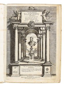 Bel frontespizio architettonico inciso in rame con erma dell'Autore al centro e in alto stemma del dedicatario Antonio Borghese, moltissime illustrazioni sia xilografiche che calcografiche nel testo, alcune a piena pagina.