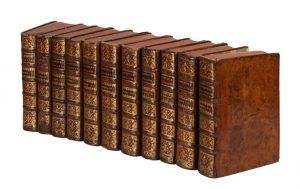 Ciascuna parte con proprio frontespizio decorato con graziose vignette calcografiche, tutti i volumi con occhietto tranne il primo. Qualche carta brunita, fioriture e aloni di umidità sparsi, uno strappo a una carta del secondo volume. Legatura coeva in piena pelle maculata con titoli dorati impressi su tasselli applicati al dorso a 5 nervi, con comparti decorati a fregi floreali impressi in oro ; tagli rossi. Cerniere stanche, qualche spellatura anche riparata e altri minimi difetti.