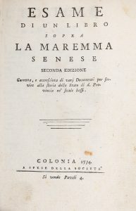 BERTOLINI STEFANO, — Esame di un libro sopra la Maremma Senese. — Seconda edizione corretta, e accresciuta... — Colonia [ma Siena] : a spese della Società, 1774. — In-8° (mm 205x130).