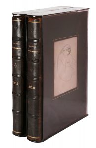 Legatura editoriale in pelle marrone, lastra incisa in argento ai piatti anteriori con bordatura oro ; nervi, fregi e titoli incisi in oro ai dorsi.