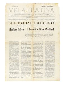 BOCCIONI UMBERTO, — Vela Latina.— Manifesto di Boccioni ai pittori meridionali. (Anno IV, n. 4).— Napoli : Vela Latina, 1916. — In-folio (mm 625x 440).