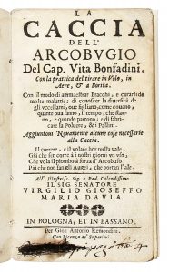 BONFANDINI VITA, — La caccia dell'arcobugio [...]. — Con la prattica del tirare in volo, in aere, & à borita... — Bologna et Bassano : Gio. Antonio Remondini, [1672]. — In-12° (mm 140x80).