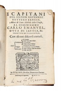 BOTERO GIOVANNI, — I capitani [...]. — Con alcuni discorsi curiosi... — In Torino : per Gio. Domenico Tarino, 1607. — 2 parti in 1 volume in-8° (mm 180x118).