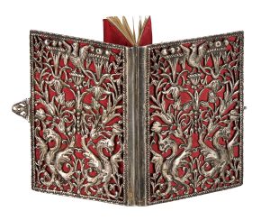 Legatura settecentesca in seta rossa e argento sbalzato e traforato con motivi floreali, cornucopie e draghi ; conservato il fermaglio..