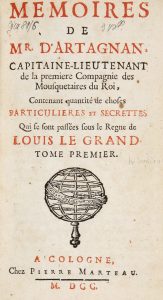 COURTILZ de SANDRAS GATIEN, — Memoires de Mr. D'Artagnan, Capitaine-Lieutenant de la premiere Compagnie des Mousquetaires du Roi [...]. — Tome Premier (-troisieme). — A Cologne : Chez Pierre Marteau, 1700. — 3 volumi in-12° (mm 152x85).