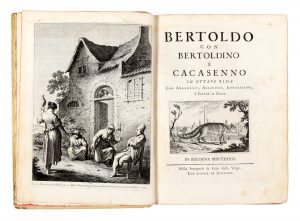CROCE GIULIO CESARE, — Bertoldo con Bertoldino e Cacasenno in ottava rima, con argomenti, allegorie, annotazioni e figure in rame. — Bologna : nella Stamperia di Lelio dalla Volpe, 1736. — In-4° (mm 295x210).