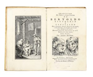 CROCE GIULIO CESARE, — Traduzion dal toscan in lengua veneziana de Bertoldo, Bertoldin e Cacasseno [...]. — Libro Primo (-Terzo). — In Padoa : per Zanbatista Conzati, 1747. — 3 volumi in-8° (mm 180x115).