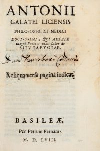 De FERRARIS ANTONIO (detto Galateo), — Liber de situ Iapygiae. — Reliqua versa pagina indicat. — Basileae [ma Lecce] : per Petrum Pernam [Giustiniani], 1558. — In-8° (mm 150x100).