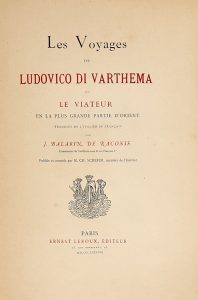 De VARTHEMA LODOVOCO, — Les voyages [...] ou le viateur en la plus grande partie d'Orient. — Traduits de l'italien en français par J. Balarin de Raconis... — Paris : Ernest Leroux, 1888. — In-8° (mm 275x180).