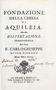 Di SAN FIORANO CARLO-GIUSEPPE, — Fondazione della Chiesa di Aquileja. — Dissertazione storico-critica… — Milano : Giuseppe Galeazzi, 1757. — 2 parti in 1 volume in-8° (mm 180x120).