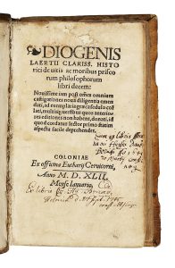 DIOGÈNES LAERTIUS, — De vitis ac moribus priscorum philosophorum libri decem… — Coloniae : ex officina Eucharii Cervicorni, 1542. — In-8° (mm 160x100).
