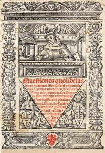 DUNS SCOTUS IOANNES, — Questiones quolibetales ex quattuor Sententiarum voluminibus [...] a preclaro doct. Anto. de Fantis Taruisino pristino nitori restitute… — (Al colophon : ) Lugduni : impresse per Iacobum Myt, 1520. — In-8° (mm 164x100).