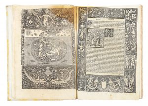 Al verso di carta [12] xilografia a piena pagina raffigurante la creazione della donna, un'altra bordura di grottesche, tritoni e putti a incorniciare la prima pagina di testo, a carta 5r raffigurazione del mondo secondo il medievale schema a T, a carta 6v xilografia della cacciata dal Paradiso, a carta 8r xilografia di Caino che uccide Abele, lungo tutto il testo moltissime vedute di città e alcune scene bibliche incise in legno ; marca dello stampatore in fine. Contenuta macchia d'unto nell'angolo superiore interno delle carte, lavori di tarlo nel medesimo punto delle carte 308-16 e 325-35, rari fogli bruniti.