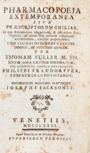 FULLER THOMAS, — Pharmacopoeia extemporanea, sive praescriptorum chillias [...]. — Editio nova caetaris emendatior... — Venetiis : Apud Franciscum ex Nicolao Pezzana, 1766. — 4 parti in 1 volume in-8° (mm 180x110).