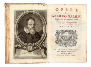 GALILEI GALILEO, — Opere [...] divise in quattro tomi, in questa nuova edizione accresciute di molte cose inedite. — Tomo primo (-quarto). — In Padova : Nella Stamperia del Seminario, appresso Gio : Manfrè, 1744. — 4 parti in 3 volumi in-4°...