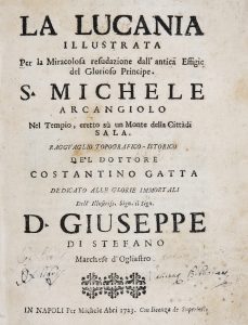 GATTA COSTANTINO — La Lucania illustrata per la miracolosa resudazione dall'antica effigie del glorioso principe. S. Michele Arcangiolo nel tempio, eretto su un monte della città di Sala. Ragguaglio topografico-istorico. — In Napoli : per...