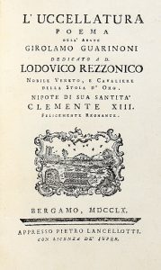 GUARINONI GIROLAMO, — L'uccellatura... — Bergamo : Pietro Lancellotti, 1760. — In-8° (mm 225x150).