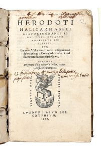 HERODOTUS HERODOTUS, — Libri VIIII. — Musarum nominibus inscripti Per Laurent. Vallam interpretati : castigati verò ac locupletati a Conrado Heresbachio... — Lugduni : apud Seb. Gryphium, 1542. — In-8° (mm 170x108).