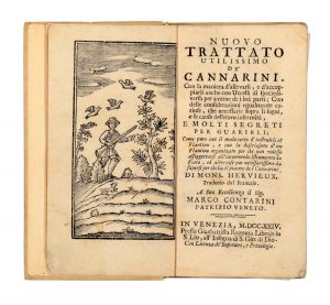 HERVIEUX de CHANTELOUP Jean-Claude, — Nuovo trattato utilissimo de' cannarini. — Con la maniera d'allevarli, e d'accoppiarli [...] come pure il modo certo d'istruirli al flautino... — In Venezia : Presso Gianbattista Regozza, 1724. — In-12°...