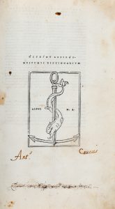 HESYCHIUS ALEXANDRINUS, — Dictionarium. — (Al colophon : ) Venetiis : in aedibus Aldi & Andreae soceri, mense Augusto 1514. — In-folio (mm 320x220).
