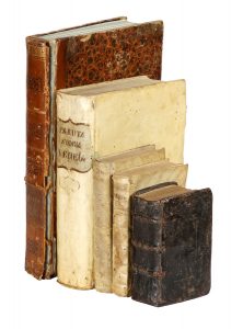 Marca dello stampatore incisa in legno sul frontespizio e in fine. Lavoro di tarlo da pagina V6 sino in fine. Legatura coeva in piena pergamena floscia con risvolti, titoli manoscritti al dorso. Forellini di tarlo e altri difetti.