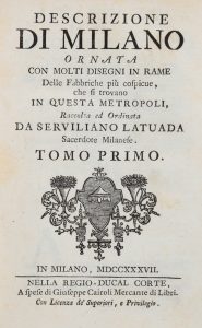 LATTUADA SERVILIANO, — Descrizione di Milano ornata con molte figure in rame delle fabbriche più cospicue [...]. —Tomo primo (-quinto). — In Milano : nella Regio-ducal corte, a spese di Giuseppe Cairoli, 1737-38. — 5 volumi in-8° (mm 160x110).