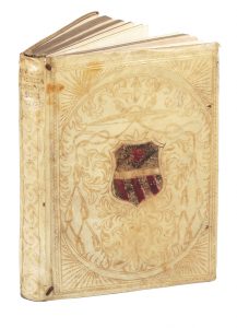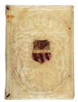 Legatura coeva alle armi in piena pergamena rigida con elaborato decoro impresso in oro ai piatti e al centro stemma del Cardinale Pietro Francesco Orsini, poi Papa Benedetto XIII, in coloritura coeva ; fregio floreale impresso in oro al dorso e titoli manoscritti. Lacerti di legacci, sguardie rinnovate e altre trascurabili mende..
