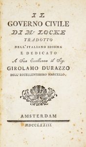 LOCKE JOHN, — Il governo civile [...] tradotto nell'italiano idioma... — Amsterdam [ma Venezia] : s.e., 1773. — In-8° (mm 195x130).