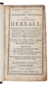 LOVELL ROBERT, — Pambotanologia sive, Enchiridion Botanicum. Or, a Compleat Herball... — Oxford : Printed by W.H. for Ric. Davis, 1665. — In-16° (mm 150x90).