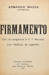 MAZZA ARMANDO, FIRMAMENTO. — Con una spiegazione di F.T. Marinetti sulle Parole in Libertà. — Milano : Edizioni futuriste di Poesia, 1920. — In-8° (mm 220x160).