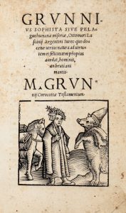 NACHTIGALL OTMAR, — Grunnius sophista sive pelagus humanae miseriae. — (Al colophon : ) Argentinae : apud Ioannem Knoblouchum, 1522. — In-8° (mm 158x100).