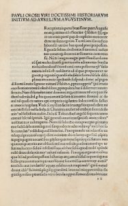 Terza edizione della storia universale che Paulus Orosius scrisse su richiesta di Sant'Agostino contro i pagani, curata da Enea Volpi. BMC VII, 1032 ; Goff O-99 ; GW M28419 ; Hain-Copinger 12100 ; IGI 7035. La copia della BSB (Ink O-83) porta data di acquisto, 1482.